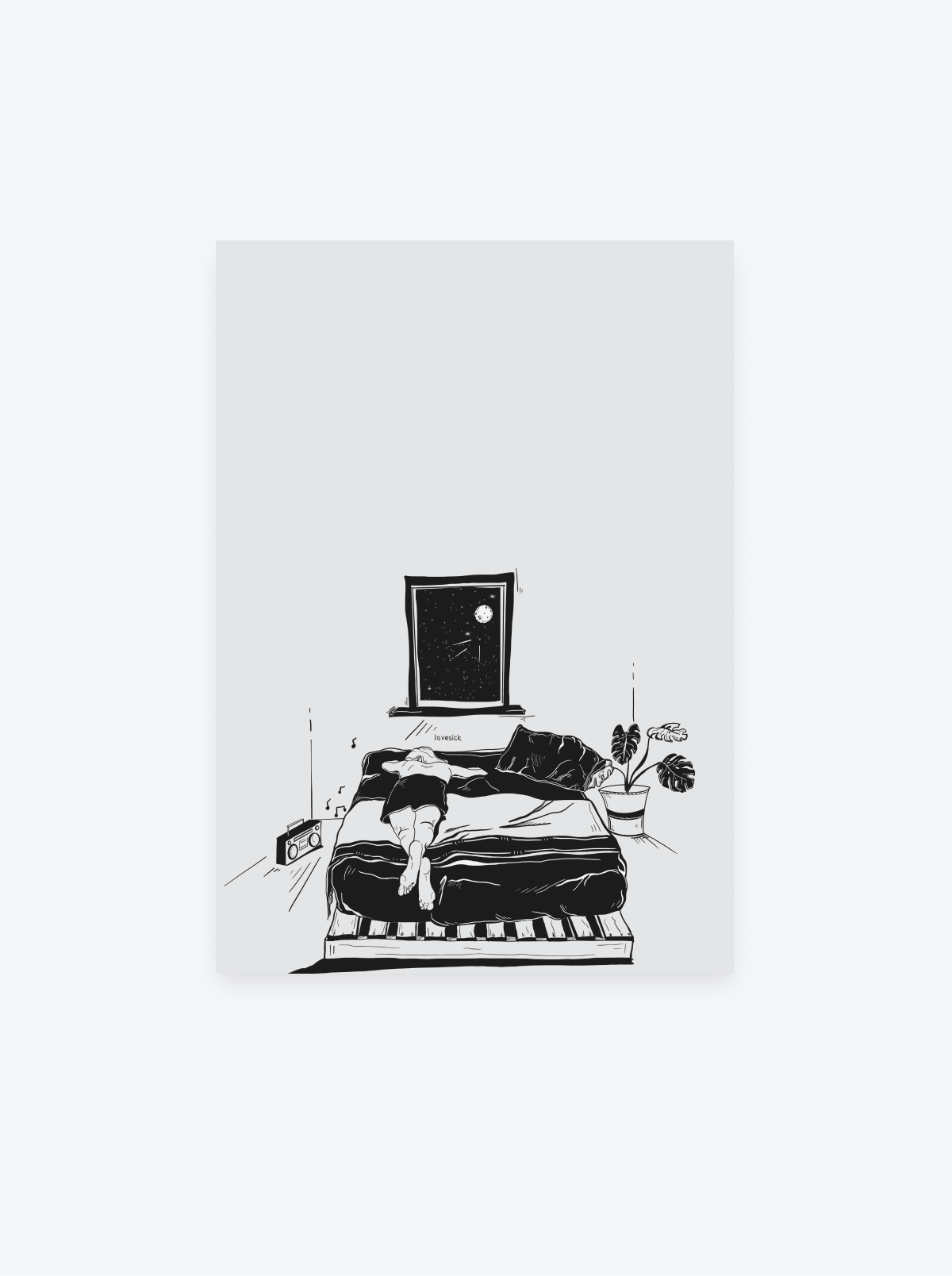 „Lovesick“ ist ein roher und zarter Giclée-Druck einer Frau im Bett, die über Liebeskummer nachdenkt. Gedruckt auf 305 g/m² Hahnemühle Photo Rag , verbindet diese Fine-Art-Illustration Verletzlichkeit mit Stärke. Erhältlich in A4, A3, A2 , gerahmt oder ungerahmt. Weltweiter Versand innerhalb von 3–5 Werktagen .