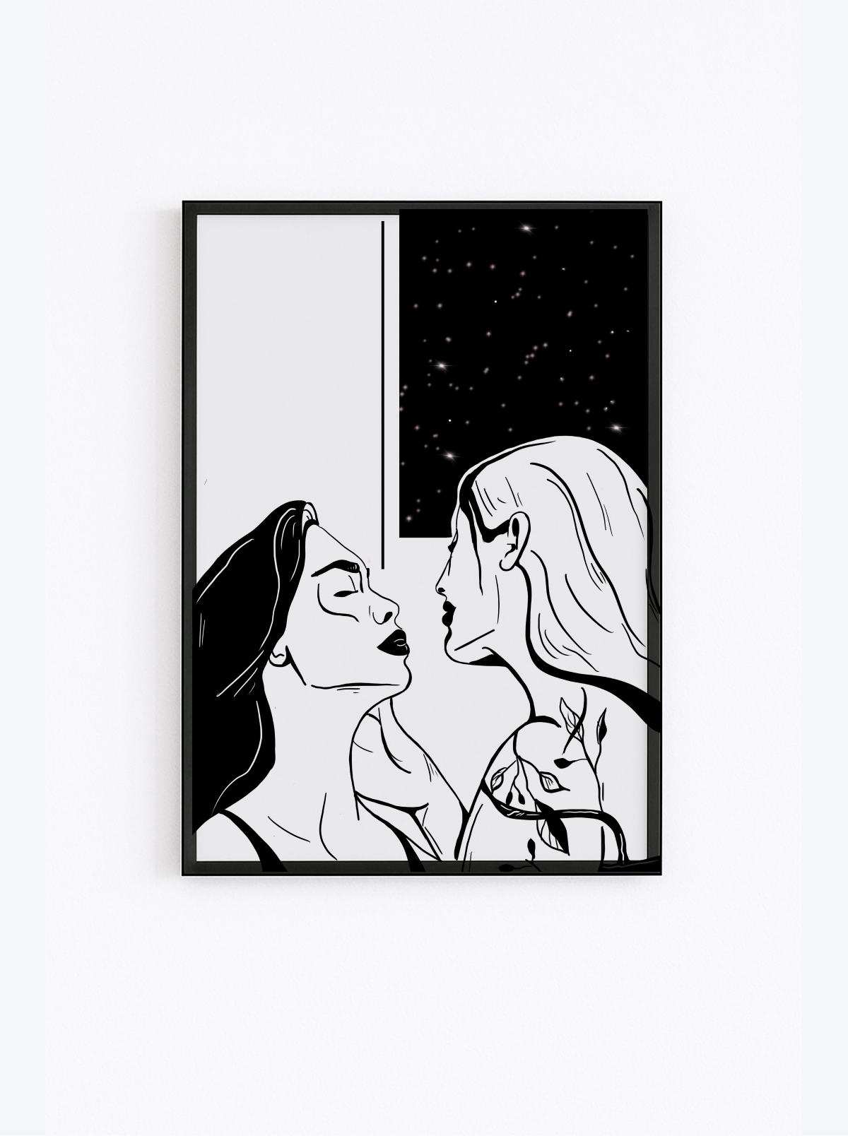 Part 3 of the Kiss Series capturing three intimate moments between a lesbian couple, celebrating sapphic love and passion. Each illustration is a high-quality giclée print on Hahnemühle Photo Rag (305 gsm, 100% cotton). Pick your favourite or collect all three prints in sizes A4–A2, framed or unframed. Worldwide shipping in 3–5 working days.