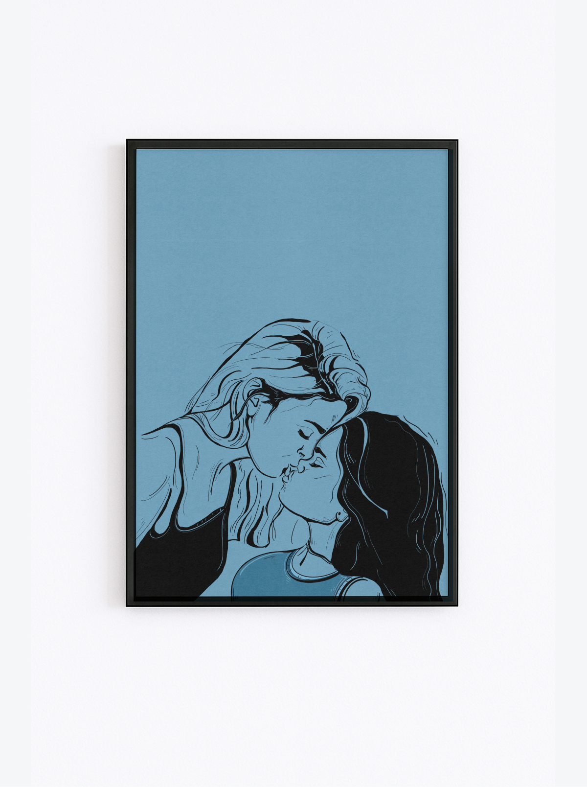 Blue Kiss – Impression d'art d'un couple lesbien s'embrassant