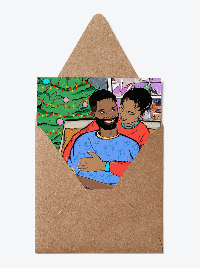 A festive gay Christmas card featuring a sweet male couple cuddling together, perfect for celebrating LGBTQ+ love this holiday season.